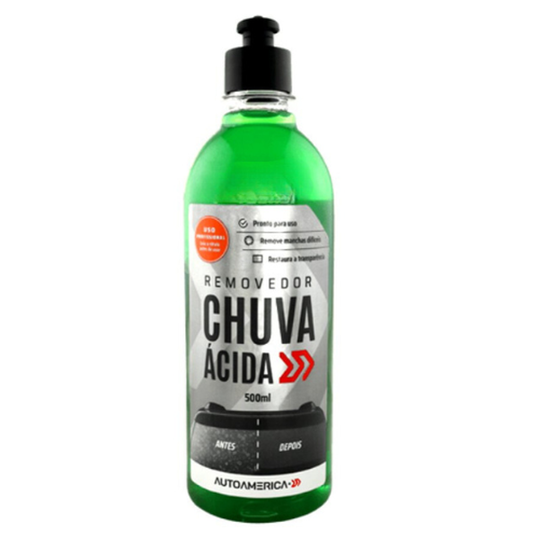 REMOVEDOR DE CHUVA ÁCIDA é indicado para remover marcas d'água de qualquer superfície externa de vidro automotivo, como respingos, seiva de árvores, sujeira da estrada, insetos, incrustações provocadas por chuva ácida e agentes químicos. Recomendável usar em pára-brisas e janelas externas.